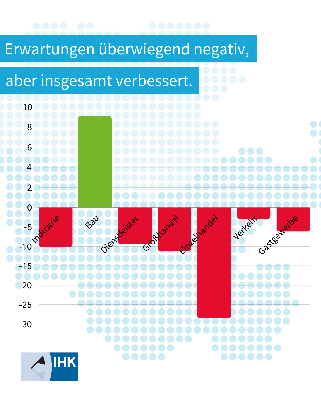 „Angesichts der aktuellen weltwirtschaftlichen Verwerfungen sind seriöse Prognosen kaum zu treffen. Der Wunsch zur Besserung ist stärker ausgeprägt, als dieses in der Wirklichkeit umzusetzen ist“, ordnet IHK-Präsident Andreas Knappstein die Umfrageergebnisse ein. Unter den Bedingungen im Umfrage-Zeitraum (24. März bis 4. April) gaben sich die Unternehmen etwas weniger pessimistisch gestimmt als zuvor. Dennoch bleiben die Erwartungen und die Lage weiterhin im roten Bereich. Lediglich 18 Prozent der Betriebe bewerten ihre derzeitige Lage als gut, 29 Prozent als schlecht. Der daraus resultierende negative Lagesaldo (-12 Punkte) zeigt eine, wenn auch nur leichte, Verschlechterung im Vergleich zum Jahresbeginn (-2 Punkte). Besonders deutlich fällt der Rückgang in den Branchen Einzelhandel (Verschlechterung um -26 Punkte auf -36 Punkte), Verkehr (-27 Punkte) und Bau (-16 Punkte) aus. Einziger Lichtblick ist der Dienstleistungssektor, der als einzige Branche einen positiven Lagesaldo meldet und sich leicht verbessern konnte. In der Industrie ist die Lage (-17 Punkte) weiter kritisch, aber verbessert gegenüber Jahresbeginn.