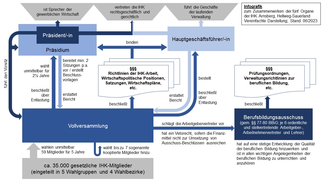 Diese Entscheidungen treffen jedoch nicht die hauptberuflichen Mitarbeiterinnen und Mitarbeiter, sondern das demokratisch gewählte Beschlussorgan der IHK - die Vollversammlung. Diese wird von den IHK-Mitgliedern alle fünf Jahre neu gewählt und repräsentiert damit die gesamte Unternehmerschaft des IHK-Bezirks. Die Vollversammlung bestimmt nicht nur über die Satzungen und den Haushalt, sie legt auch die Schwerpunkte der IHK-Arbeit und die wirtschaftspolitischen Positionen fest. Vielen gilt sie damit als das "Parlament der Wirtschaft".