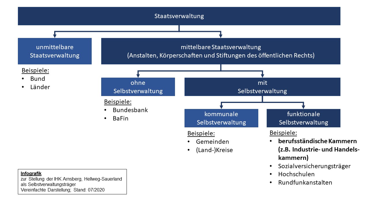 Die Industrie- und Handelskammern sind Selbstverwaltungskörperschaft des öffentlichen Rechts. Als solche zählen sie zur mittelbaren Staatsverwaltung und haben einen gesetzlich geregelten Aufgabenbereich. Alle Gewerbetreibenden mit Ausnahme reiner Handwerksunternehmen, landwirtschaftlicher Betriebe und Freiberufler (die nicht ins Handelsregister eingetragen sind) sind kraft Gesetzes Mitglied in jeder Industrie- und Handelskammer, in deren Bezirk eine Betriebsstätte liegt.  Das unterscheidet die Industrie- und Handelskammer von privatrechtlichen Berufs- oder Branchenverbänden mit freiwilliger Mitgliedschaft.